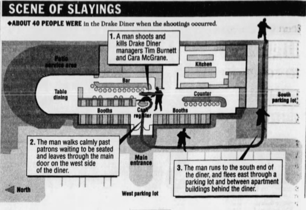 Burnett, who had come into Drake Diner on his day off to set up a Christmas tree, ran to help McGrane. The man shot Burnett, and he too died instantly.