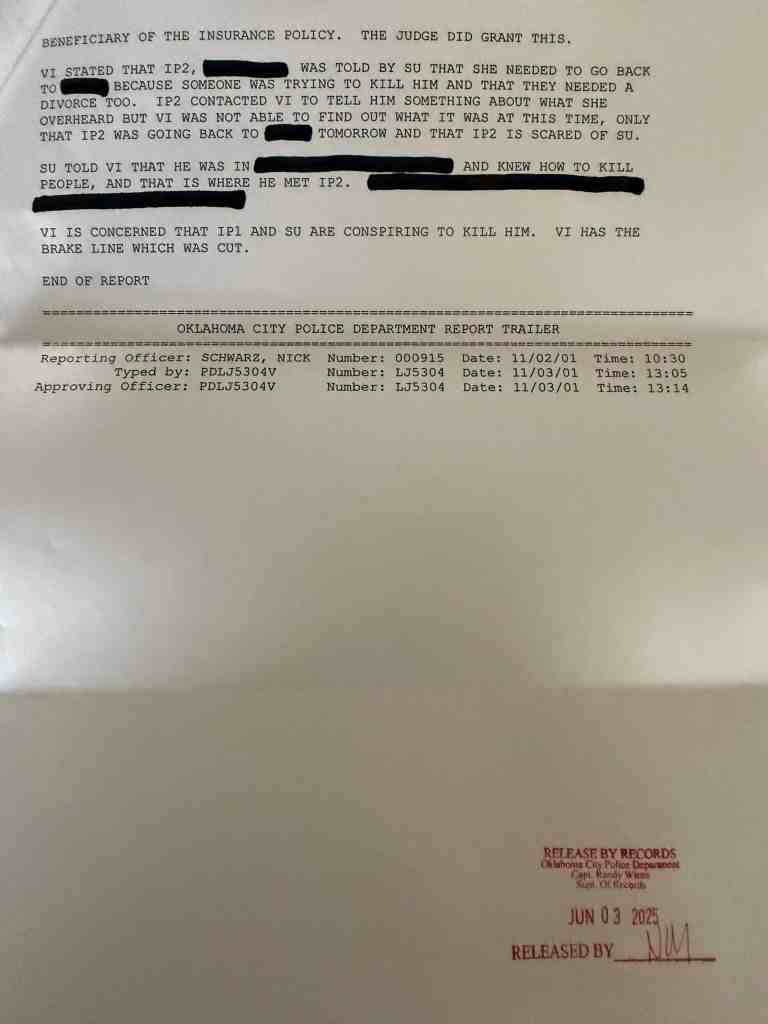 Bottom: Copy of the Oklahoma City police report filed by Rob Andrew. In it, he reported that his brake line had been cut and stated concerns for his safety.
